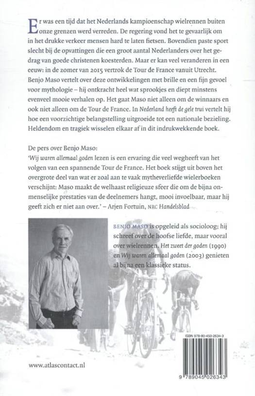 Er was een tijd dat het Nederlands kampioenschap wielrennen buiten onze grenzen werd verreden. De regering vond het te gevaarlijk om in het drukke verkeer mensen hard te laten fietsen. Bovendien paste sport slecht bij de opvattingen die een groot aantal Nederlanders over het gedrag van goede christenen koesterden. Maar er kan veel veranderen in een eeuw: in de zomer van 2015 vertrok de Tour de France vanuit Utrecht. Benjo Maso vertelt over deze ontwikkelingen met brille en een fijn gevoel voor mythologie – hij ontkracht heel wat sprookjes en diept minstens evenveel mooie verhalen op. Het gaat Maso niet alleen om de winnaars en ook niet alleen om de Tour de France. In Nederland heeft de gele trui vertelt hij hoe een voorzichtige belangstelling uitgroeide tot een nationale bezieling. Heldendom en tragiek wisselen elkaar af in dit indrukwekkende boek.