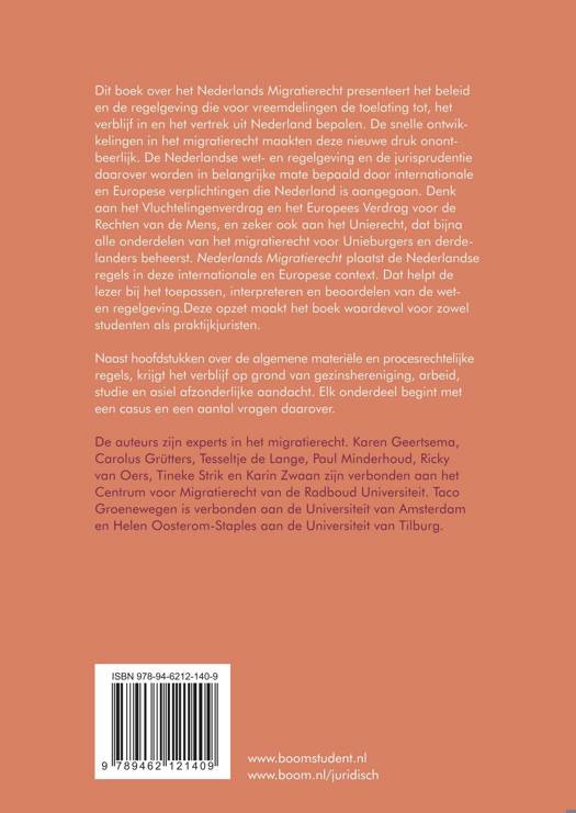 Dit boek over het Nederlands Migratierecht presenteert het beleid en de regelgeving die voor vreemdelingen de toelating tot, het verblijf in en het vertrek uit Nederland bepalen. De snelle ontwikkelingen in het migratierecht maakten deze nieuwe druk onontbeerlijk. De Nederlandse wet- en regelgeving en de jurisprudentie daarover worden in belangrijke mate bepaald door internationale en Europese verplichtingen die Nederland is aangegaan. Denk aan het Vluchtelingenverdrag en het Europees Verdrag voor de Rechten van de Mens, en zeker ook aan het Unierecht, dat bijna alle onderdelen van het migratierecht voor Unieburgers en derdelanders beheerst. Nederlands Migratierecht plaatst de Nederlandse regels in deze internationale en Europese context. Dat helpt de lezer bij het toepassen, interpreteren en beoordelen van de weten regelgeving.Deze opzet maakt het boek waardevol voor zowel studenten als praktijkjuristen. Naast hoofdstukken over de algemene materiële en procesrechtelijke regels, krijgt het verblijf op grond van gezinshereniging, arbeid, studie en asiel afzonderlijke aandacht. Elk onderdeel begint met een casus en een aantal vragen daarover. De auteurs zijn experts in het migratierecht. Karen Geertsema, Carolus Grütters, Tesseltje de Lange, Paul Minderhoud, Ricky van Oers, Tineke Strik en Karin Zwaan zijn verbonden aan het Centrum voor Migratierecht van de Radboud Universiteit. Taco Groenewegen is verbonden aan de Universiteit van Amsterdam en Helen Oosterom-Staples aan de Universiteit van Tilburg.