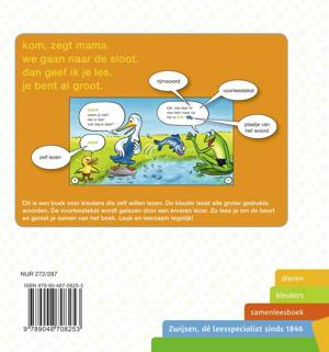 Kleuters samenleesboeken: Een samenleesboek voor kleuters. De rechterpagina’s zijn woordpagina’s die de kleuter leest. De linkerpagina’s zijn voorleespagina’s voor de ervaren lezer. Ga er eens lekker voor zitten en lees gezellig samen in dit boek. Kom, zegt mama. We gaan naar de sloot. Dan geef ik je les. Je bent al groot.