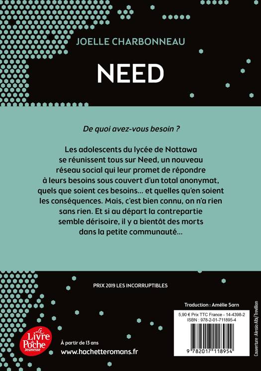 Les adolescents du lycée de Nottawa se réunissent tous sur NEED, un nouveau réseau social qui leur promet de répondre à leurs besoins sous couvert d’un total anonymat, quels que soient ces besoins… et quelles qu’en soient les conséquences. Car, c’est bien connu, on n’a rien sans rien. Et si au départ la contrepartie semble dérisoire, il y a bientôt des morts dans la petite communauté…