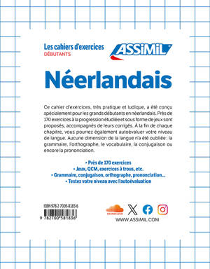 Ce cahier d'exercices, très pratique et ludique, a été conçu spécialement pour les grands débutants en néerlandais. Près de 170 exercices à la progression étudiée et sous forme de jeux sont proposés, accompagnés de leurs corrigés. À la fin de chaque chapitre, vous pourrez également autoévaluer votre niveau de langue. Aucune dimension de la langue n'a été oubliée : la grammaire, l'orthographe, le vocabulaire, la conjugaison ou encore la prononciation.