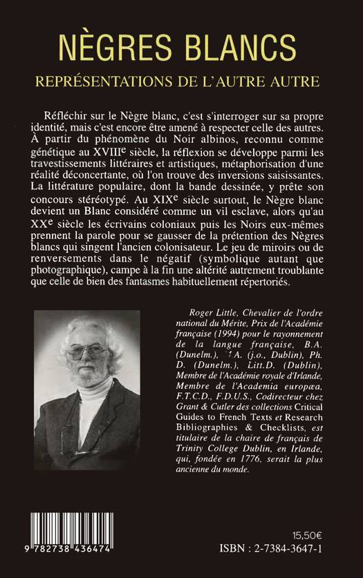 Réfléchir sur le Nègre blanc, c'ests 'interroger sur sa propre identité, mais c'est encore être amené à respecter celle des autres. À partir du phénomène du Noir albinos, reconnu comme génétique au XVIIIe siècle, la réflexion se développe parmi les travestissements littéraires et artistiques, notamment dans la littérature et la bande dessinée. Au XIXe siècle surtout, le Nègre blanc devient un Blanc considéré comme un vil esclave, alors qu'au XXe siècle, les écrivains coloniaux puis les Noirs eux-mêmes prennent la parole pour se gausser de la prétention des Nègres blancs qui singent le colonisateur...
