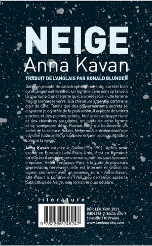 Passage en poche de ce roman marquant d'Anna Kavan. Chef-d'oeuvre de science-fiction littéraire, mise en garde contre le changement c limatique et le totalitarisme, exploration féministe de la violence, Neige est le livre culte et justement sauvé de l'oubli de la grande écrivaine britannique du XXe siècle Anna Kavan, admirée par Anaïs Nin, Doris Lessing, Patti Smith...