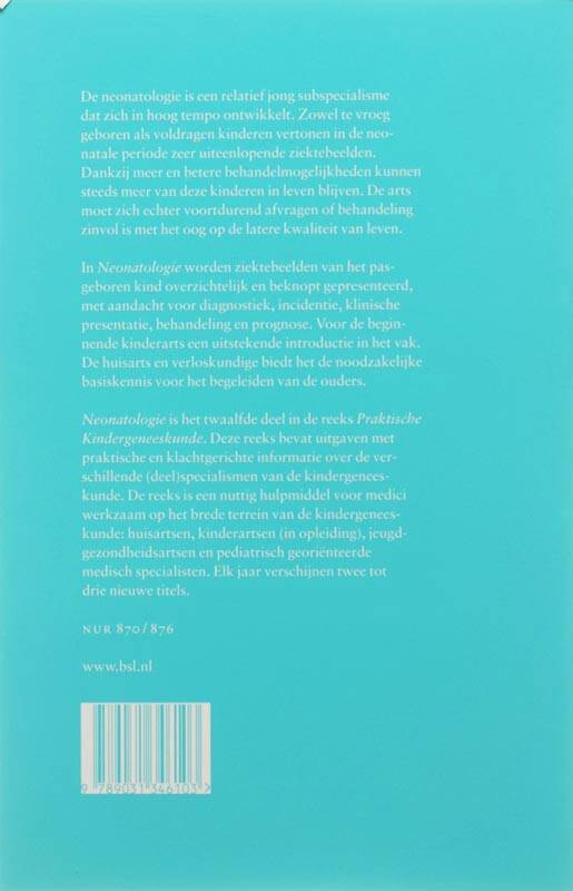 De neonatologie is een relatief jong subspecialisme dat zich in hoog tempo ontwikkelt. Zowel te vroeg geboren als voldragen kinderen vertonen in de neonatale periode zeer uiteenlopende ziektebeelden. Dankzij meer en betere behandelmogelijkheden kunnen steeds meer van deze kinderen in leven blijven. De arts moet zich echter voortdurend afvragen of behandeling zinvol is met het oog op de latere kwaliteit van leven.In Neonatologie worden ziektebeelden van het pasgeboren kind overzichtelijk en beknopt gepresenteerd, met aandacht voor diagnostiek, incidentie, klinische presentatie, behandeling en prognose. Voor de beginnende kinderarts een uitstekende introductie in het vak. De huisarts en verloskundige biedt het de noodzakelijke basiskennis voor het begeleiden van de ouders.Neonatologie is het twaalfde deel in de reeks Praktische Kindergeneeskunde. Deze reeks bevat uitgaven met praktische en klachtgerichte informatie over de verschillende (deel) specialismen van de kindergeneeskunde. Elk jaar verschijnen twee tot drie nieuwe titels.