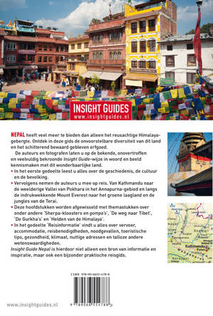 De auteurs en fotografen laten u op de bekende, onovertroffen en veelvuldig bekroonde Insight Guide-wijze in woord en beeld kennismaken met al deze opmerkelijke bezienswaardigheden, landschappen en culturen. In de eerste hoofdstukken leest u alles over de geschiedenis en cultuur. Daarna volgt een gedeelte over o.a. de bevolking, festivals, kunstnijverheid, trektochten en de Nepalese keuken. Vervolgens nemen de auteurs u mee op reis. Van de hoofdstad Kathmandu naar de weelderige Vallei van Pokhara in het Annapurnagebied. Langs de indrukwekkende Mount Everest naar het mysterieuze Thyangbocheklooster en vervolgens naar de uitgestrekte bossen en jungle van de Terai. Deze hoofdstukken worden afgewisseld met themapagina's over onder andere 'Sherpa-kloosters en gompa's', de 'Geboorteplaats van Boeddha', en 'De Weg naar Tibet'.