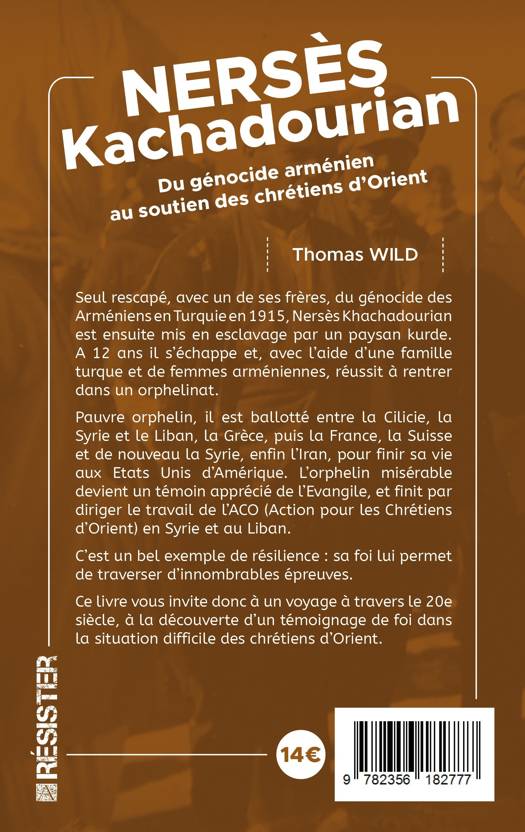 Seul rescapé, avec un de ses frères, du génocide des Arméniens en Turquie en 1915, Nersès Khachadourian est ensuite mis en esclavage par un paysan kurde. A 12 ans il s'échappe et, avec l'aide d'une famille turque et de femmes arméniennes, réussit à rentrer dans un orphelinat. Pauvre orphelin, il est ballotté entre la Cilicie, la Syrie et le Liban, la Grèce, puis la France, la Suisse et de nouveau la Syrie, enfin l'Iran, pour finir sa vie aux Etats Unis d'Amérique. L'orphelin misérable devient un témoin apprécié de l'Evangile, et finit par diriger le travail de l'ACO (Action pour les Chrétiens d'Orient) en Syrie et au Liban. C'est un bel exemple de résilience : sa foi lui permet de traverser d'innombrables épreuves. Ce livre vous invite donc à un voyage à travers le 20e siècle, à la découverte d'un témoignage de foi dans la situation difficile des chrétiens d'Orient.