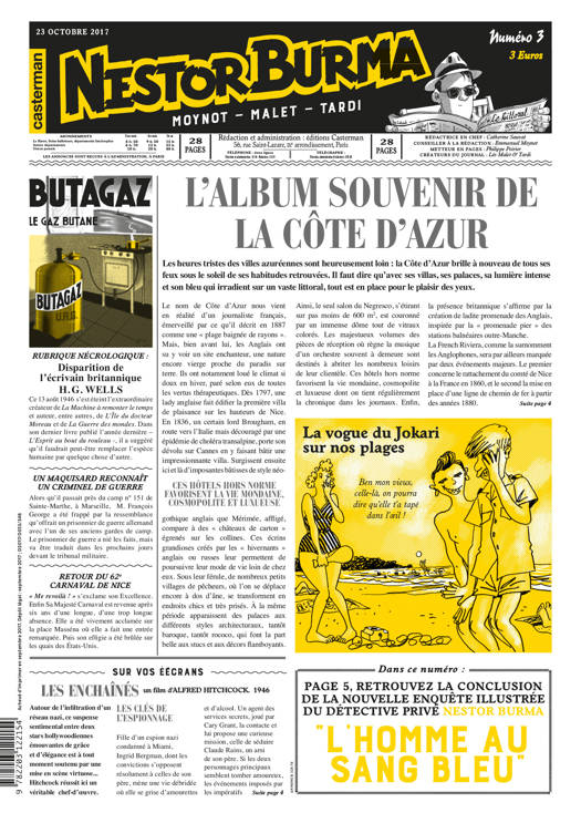 Le journal de publication en trois numéros de l'album éponyme à paraître le 25 octobre 2017. Aux côtés des planches du nouvel album dessiné par Emmanuel Moynot, le sommaire de ce journal propose : - Un reportage sociologique sur les comportements de l'époque de Nestor Burma - Un article sur l'actualité culturelle cinématographique de l'époque de Nestor Burma - Des réclames - Des petites annonces décalées et très drôles