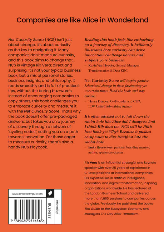 'Reading this book feels like embarking on a journey of discovery. It brilliantly illustrates how curiosity can drive innovation, challenge norms, and support your business.' - Karin Van Hoecke, General Manager Transformation & Data KBC 'Net Curiosity Score will inspire positive behavioral change in these fascinating yet uncertain times. Read the book and stay curious.' - Harry Demey, Co-Founder and CEO, LDV United Advertising Agency 'It's often advised not to fall down the rabbit hole like Alice did. I disagree. And I think Rik does too. NCS will be Rik's best book yet. Why? Because it pushes companies to dive headfirst into the rabbit hole.' - ianka fleerackers, personal branding mentor, author, speaker, podcaster