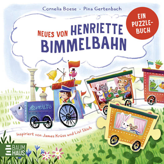 Seit 1958 begeistert Henriette Bimmelbahn Generationen von Kindern - jetzt startet sie in ein neues, besonderes Abenteuer! Mit Hase, Kuh, Katze und sogar einem Zebra an Bord geht die fröhliche alte Eisenbahn auf große Reise. Liebevolle Reime, farbenfrohe Illustrationen und stabile Pappseiten laden zum Entdecken ein. Auf jeder Seite kann gepuzzelt und ins Innere der Waggons geschaut werden. Das Highlight: Mit den Puzzleteilen von Lok und Waggons entsteht auch außerhalb des Buches eine eigene kleine Bimmelbahn!Mit den zauberhaften Reimen von Cornelia Boese und den farbenfrohen Bildern von Pina Gertenbach - eine liebevolle Hommage an James Krüss und Lisl Stich.