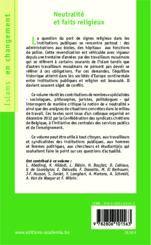 La question du port de signes religieux dans les services publics se rencontre partout. L'équilibre historique atteint dans les sociétés d'Europe continentale entre institutions publiques et religion est aujourd'hui bousculé. Il devient souvent objet de conflit. Ce volume réunit les contributions de spécialistes sociologues, philosophes, juristes, politologues qui interrogent de manière critique la notion de « neutralité », ainsi que des analyses de situations concrètes du monde du travail.