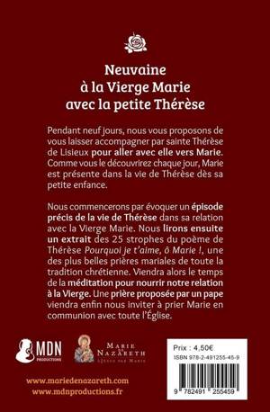Pendant neuf jours, nous vous proposons de vous laisser accompagner par sainte Thérèse de Lisieux pour aller avec elle vers Marie. Comme vous le découvrirez chaque jour, Marie est présente dans la vie de Thérèse dès sa petite enfance. Nous commencerons par évoquer un épisode précis de la vie de Thérèse dans sa relation avec la Vierge Marie. Nous lirons ensuite un extrait des 25 strophes du poème de Thérèse Pourquoi je t'aime, ô Marie !, une des plus belles prières mariales de toute la tradition chrétienne. Viendra alors le temps de la méditation pour nourrir notre relation à la Vierge. Une prière proposée par un pape viendra enfin nous inviter à prier Marie en communion avec toute l'Église.