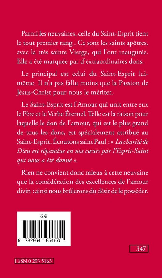 Parmi les neuvaines, celle du Saint-Esprit tient le tout premier rang . Ce sont les saints apôtres, avec la très sainte Vierge, qui l'ont inaugurée. Elle a été marquée par de dons extraordinaires. Le principal est celui du Saint-Esprit lui-même. Il n'a pas fallu moins que la Passion de Jésus-Christ pour nous le mériter. Le Saint-Esprit est l'Amour qui unit entre eux le Père et le Verbe Éternel. Telle est la raison pour laquelle le don de l'amour, qui est le plus grand de tous les dons, est spécialement attribué au Saint-Esprit. Écoutons saint Paul : « La charité de Dieu est répandue en nos coeurs par l'Esprit-Saint qui nous a été donné ». Rien ne convient donc mieux à cette neuvaine que la considération des excellences de l'amour divin : ainsi nous brûlerons du désir de le posséder. A propos de l'auteur : Le bienheureux Columba Marmion est né le 1er avril 1858 à Dublin (Irlande) et décédé le 30 janvier 1923 à l'abbaye de Maredsous, dont il a été le 3e Abbé. Il se rendit illustre comme père de ses moines et directeur spirituel, par sa sainteté de vie, sa doctrine spirituelle et son éloquence. Il a été béatifié par Jean-Paul II le 3 septembre 2000. Déjà paru dans la Collection du Laurier : Venez au Christ, vous tous qui peinez et La mère du Verbe Incarné.