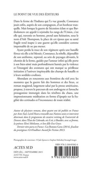 Dans la ferme de l'Indiana qui l'a vue grandir, Constance jouit enfin, auprès de son compagnon, d'un bonheur tranquille. Mais lorsque la guerre de Sécession éclate et que Bartholomew est appelé à rejoindre les rangs de l'armée de l'Union, c'est elle qui, travestie en homme, prend sans hésitation, sous le nom d'Ash Thompson, la place de cet époux que sa santé fragile rend inapte à une guerre qu'elle considère comme impensable de ne pas mener. Ayant perdu la trace de son régiment après une bataille féroce où elle a été blessée, Constance, la rebelle, dépouillée de son uniforme, reprend, au sein de paysages dévastés, le chemin de la ferme, guidée par l'amour infini qu'elle porte à son bien-aimé mais profondément hantée par la violence et l'étrangeté des aventures qui ont marqué sa périlleuse initiation à l'univers impitoyable des champs de bataille et à leurs sordides coulisses. Abondant en rencontres aux frontières du réel avec les monstres que la guerre fait des hommes et des lieux, ce roman magistral, largement salué par la presse américaine, propose, à travers le parcours de son androgyne et farouche protagoniste immergée dans les ténèbres du chaos, une impressionnante méditation en forme d'épopée sur la fragilité des certitudes et l'inconstance de toute réalité.