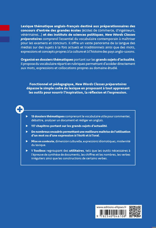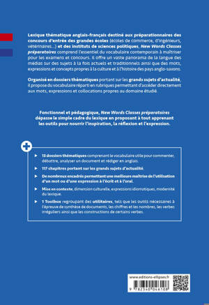 New Words classes préparatoires présente un large panorama de la langue des medias, mais aussi des mots, expressions et concepts propres à l’histoire et à la culture des pays anglo-saxons. S’adressant spécifiquement aux préparationnaires des concours d’entrée aux grandes écoles et des instituts de sciences politiques, il est l’outil indispensable pour réussirà l’écrit et à l’oral.