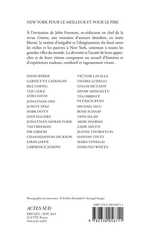 Sur la notion d'inégalité à New York, et l'élargissement du fossé entre les riches et les pauvres, en particulier à travers le problème du logement commun à toutes les grandes villes du monde, une trentaine d'écrivains contemporains ont offert un texte, à l'invitation de John Freeman, ancien rédacteur en chef de la revue Granta. Ils s'appellent, notamment, Bill Cheng, Lydia Davis, Jonathan Dee, Junot Díaz, Valeria Luiselli, Colum Mc Cann, Dinaw Mengestu, Téa Obreht, Jonathan Safran Foer, Taiye Selasi, Zadie Smith, Edmund White... D'autres sont moins connus, mais tout aussi (im)pertinents. La diversité et l'acuité de leurs approches et de leurs visions composent un recueil d'histoires et d'expériences exaltant, combatif, rageusement vivant. Quand la littérature prend notre monde entre quatre