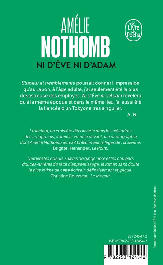 Stupeur et tremblements pourrait donner l'impression qu'au Japon, à l'âge adulte, j'ai seulement été la plus désastreuse des employés. Ni d'ève ni d'Adam révélera qu'à la mème époque et dans le mème lieu, j'ai aussi été la fiancée d'un Tokyoïte très singulier.