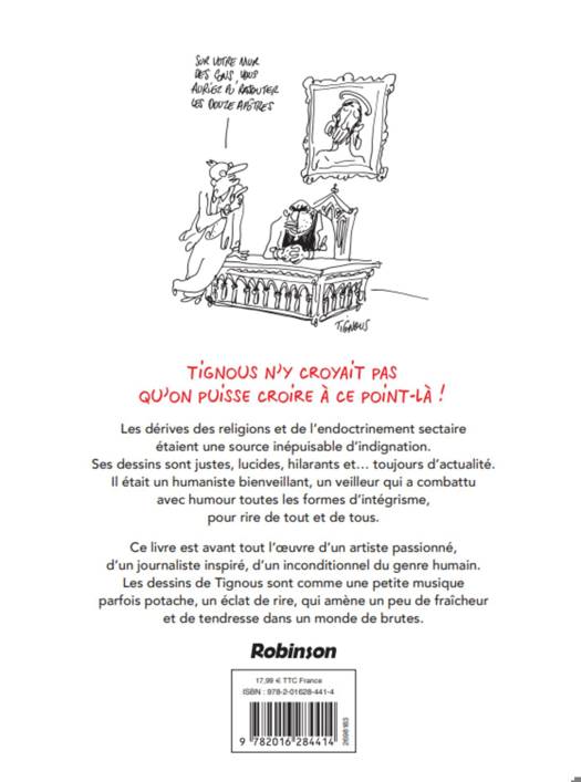 Tignous n’y croyait pas qu’on puisse croire à ce point-là ! Les dérives des religions et de l’endoctrinement sectaire étaient une source inépuisable d’indignation. Ses dessins sont justes, lucides, hilarants et… toujours d’actualité. Il était un humaniste bienveillant, un veilleur qui a combattu avec humour toutes les formes d’intégrisme, pour rire de tout et de tous.