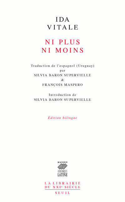 Après avoir traduit la poésie d’Alvaro Mutis puis celle de César Vallejo, François Maspero avait entrepris de traduire Ida Vitale. La mort l’a surpris au cœur de ce travail. Silvia Baron Supervielle a pris le relais. Elle a choisi et traduit la plupart des poèmes qui composent cette anthologie. Ida Vitale a reçu en 2015 le prix Reina Sofía qui est la plus haute distinction pour la poésie ibéro-américaine consacrant ainsi la poète uruguayenne comme une des voix majeures de la poésie de langue espagnole. Annie Morvan et François Vitrani