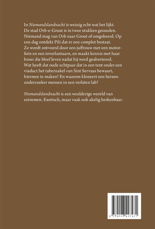 De stad Orb-e-Grout is in tweeën gesneden. Niemand mag van Orb naar Grout of omgekeerd. En niets is er wat het lijkt. Op een dag ontdekt hoofdpersoon Pili dat er een complot bestaat. Ze wordt ontvoerd door een juffrouw met een motorfiets en een toverlantaarn en maakt kennis met haar broer die bleef leven nadat hij werd geaborteerd. Maar wat heeft dat oude echtpaar dat het tabernakel van Sint Servaas bewaart, hiermee te maken? En waarom kloneert een hersenonderzoeker mensen in een verlaten lab? Estor schetst in Niemandslandnacht een weelderige wereld van extremen. Exotisch, maar vaak ook akelig herkenbaar.
