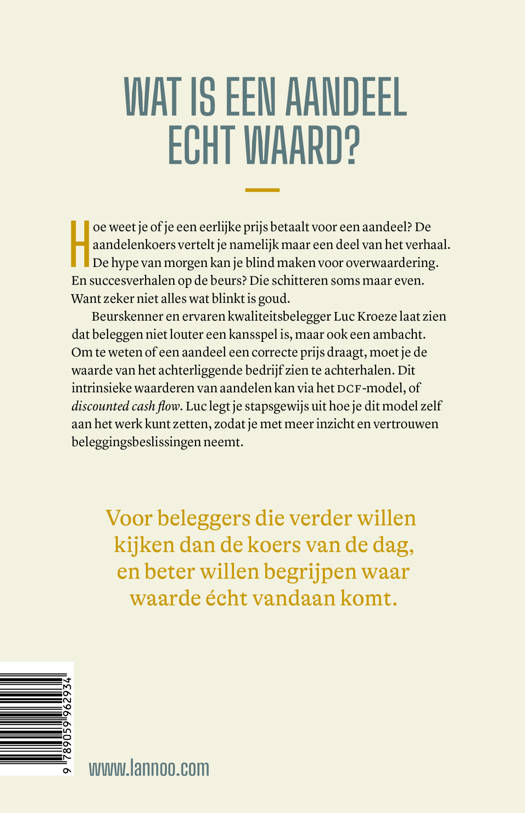 Hoe weet je of je een eerlijke prijs betaalt voor een aandeel? De aandelenkoers vertelt je namelijk maar een deel van het verhaal. De hype van morgen kan je blind maken voor overwaardering. En succesverhalen op de beurs? Die schitteren soms maar even. Want zeker niet alles wat blinkt is goud. Beurskenner en ervaren kwaliteitsbelegger Luc Kroeze laat zien dat beleggen niet louter een kansspel is, maar ook een ambacht. Om te weten of een aandeel een correcte prijs draagt, moet je de waarde van het achterliggende bedrijf zien te achterhalen. Dit intrinsieke waarderen van aandelen kan via het dcf-model, of discounted cash flow. Luc legt je stapsgewijs uit hoe je dit model zelf aan het werk kunt zetten, zodat je met meer inzicht en vertrouwen beleggingsbeslissingen neemt. Voor beleggers die verder willen kijken dan de koers van de dag, en beter willen begrijpen waar waarde écht vandaan komt.