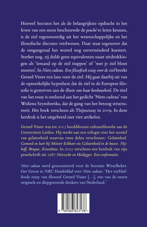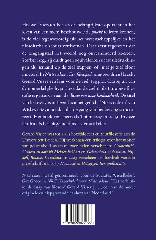 Hoewel Socrates het als de belangrijkste opdracht in het leven van een mens beschouwde de psuchè te leren kennen, is de ziel tegenwoordig uit het wetenschappelijke en het filosofische discours verdwenen. Daar staat tegenover dat de omgangstaal het woord nog onverminderd koestert. Sterker nog, zij duldt geen equivalenten naast uitdrukkingen als ‘iemand op de ziel trappen’ of ‘met je ziel bloot moeten’. In Niets cadeau. Een filosofisch essay over de ziel breekt Gerard Visser een lans voor de ziel. Hij gaat daarbij uit van de opmerkelijke hypothese dat de ziel in de Europese filosofie is gestorven aan de illusie van haar kenbaarheid. De titel van het essay is ontleend aan het gedicht ‘Niets cadeau’ van Wisława Szymborska, dat de gang van het betoog structureert. Het boek verscheen als Thijmessay in 2009. In deze herdruk is het uitgebreid met vier artikelen.