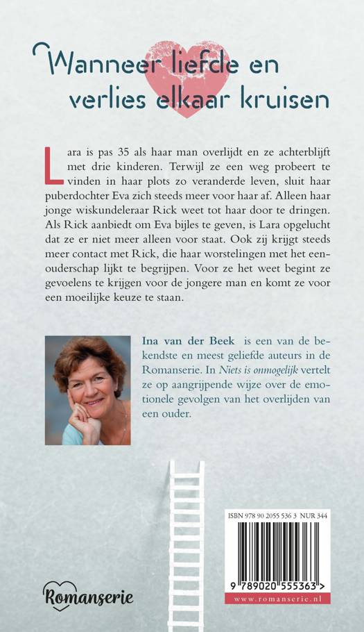 ‘Niet is onmogelijk’ is een aangrijpende roman van Ina van der Beek over een jonge moeder die er plots alleen voor komt te staan. Lara moet haar hoofd financieel boven water houden en tegelijk voor haar drie kinderen zorgen, terwijl ze zelf bijna verdrinkt in rouw en verdriet. Langzaam vindt ze een nieuwe weg, maar het leven blijft ingewikkeld. Zeker als haar puberende dochter Eva in de problemen raakt op school. Gelukkig biedt Rick van Santen, Eva's wiskundeleraar, aan te helpen met haar schoolwerk. Ook Lara voelt zich gehoord en al snel wordt ze verliefd op de jonge docent, maar dit gevoel stopt ze diep weg: haar focus moet liggen op haar kinderen en haar eigen belangen doen er nu niet toe. Ze komt voor een moeilijke keuze te staan: haar gezin of de liefde?
