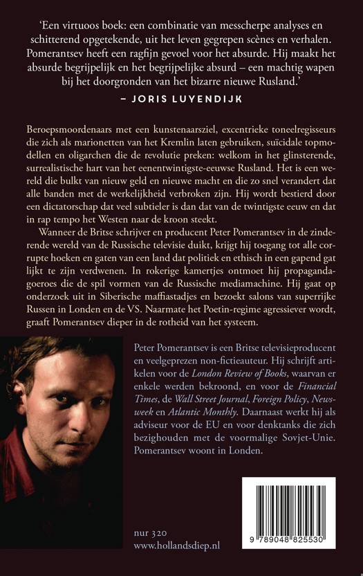 'Een virtuoos boek: een combinatie van messcherpe analyses en schitterend opgetekende, uit het leven gegrepen scènes en verhalen. Pomerantsev heeft een ragfijn gevoel voor het absurde. Hij maakt het absurde begrijpelijk en het begrijpelijke absurd - een machtig wapen bij het doorgronden van het bizarre nieuwe Rusland.' Joris Luyendijk