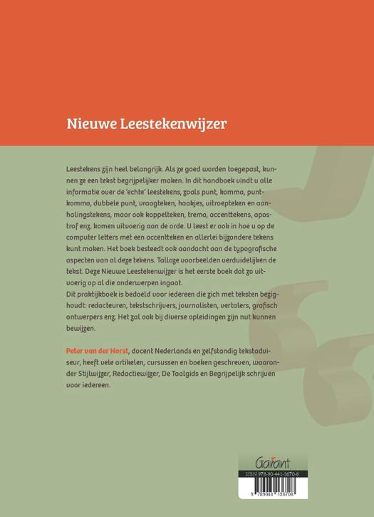 Leestekens zijn heel belangrijk. Als ze goed worden toegepast, kunnen ze een tekst begrijpelijker maken. In dit handboek vindt u alle informatie over de ‘echte’ leestekens, zoals punt, komma, puntkomma, dubbele punt, vraagteken, haakjes, uitroepteken en aanhalingstekens, maar ook koppelteken, trema, accenttekens, apostrof enz. komen uitvoerig aan de orde. U leest er ook in hoe u op de computer letters met een accentteken en allerlei bijzondere tekens kunt maken. Het boek besteedt ook aandacht aan de typografische aspecten van al deze tekens. Talloze voorbeelden verduidelijken de tekst. Deze Nieuwe Leestekenwijzer is het eerste boek dat zo uitvoerig op al die onderwerpen ingaat. Dit praktijkboek is bedoeld voor iedereen die zich met teksten bezighoudt: redacteuren, tekstschrijvers, journalisten, vertalers, grafisch ontwerpers enz. Het zal ook bij diverse opleidingen zijn nut kunnen bewijzen.