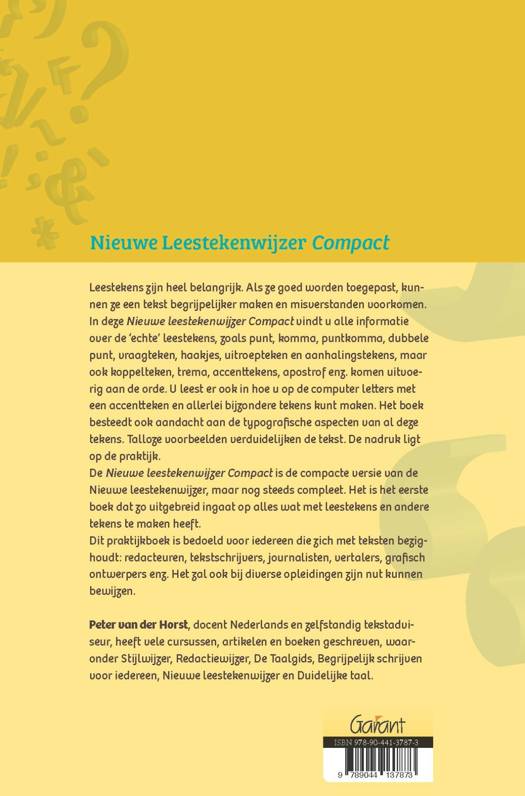 over de ‘echte’ leestekens, zoals punt, komma, puntkomma, dubbele punt, vraagteken, haakjes, uitroepteken en aanhalingstekens, maar ook koppelteken, trema, accenttekens, apostrof enz. komen uitvoerig aan de orde. U leest er ook in hoe u op de computer letters met een accentteken en allerlei bijzondere tekens kunt maken. Het boek besteedt ook aandacht aan de typografische aspecten van al deze tekens. Talloze voorbeelden verduidelijken de tekst. De nadruk ligt op de praktijk.