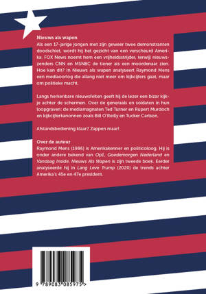 Als een 17-jarige jongen met zijn geweer twee demonstranten doodschiet, wordt hij het gezicht van een verscheurd Amerika. FOX News noemt hem een vrijheidsstrijder, terwijl nieuwszenders CNN en MSNBC de tiener als een moordenaar zien. Hoe kan dit? In Nieuws als wapen analyseert Raymond Mens een mediaoorlog die allang niet meer om kijkcijfers gaat, maar om politieke macht. Langs herkenbare nieuwsfeiten geeft hij de lezer een bizar kijkje achter de schermen. Over de generaals en soldaten in hun loopgraven: de mediamagnaten Ted Turner en Rupert Murdoch en kijkcijferkanonnen zoals Bill O’Reilly en Tucker Carlson. Afstandsbediening klaar? Zappen maar!