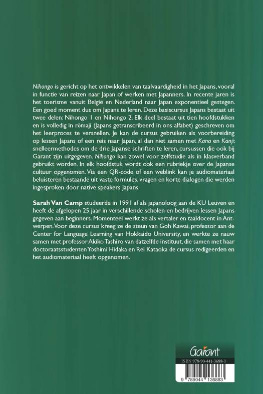 Nihongo is gericht op het ontwikkelen van taalvaardigheid in het Japans, vooral in functie van reizen naar Japan of werken met Japanners. In recente jaren is het toerisme vanuit België en Nederland naar Japan exponentieel gestegen. Een goed moment dus om Japans te leren. Deze basiscursus Japans bestaat uit twee delen: Nihongo 1 en Nihongo 2. Elk deel bestaat uit tien hoofdstukken en is volledig in romaji (Japans getranscribeerd in ons alfabet) geschreven om het leerproces te versnellen. Je kan de cursus gebruiken als voorbereiding op lessen Japans of een reis naar Japan, al dan niet samen met Kana en Kanji: snelleermethodes om de drie Japanse schriften te leren, cursussen die ook bij Garant zijn uitgegeven. Nihongo kan zowel voor zelfstudie als in klasverband gebruikt worden. In elk hoofdstuk wordt ook een rubriekje over de Japanse cultuur opgenomen. Via een QR-code of een weblink kan je audiomateriaal beluisteren bestaande uit vaste formules, vragen en korte dialogen die werden ingesproken door native speakers Japans.