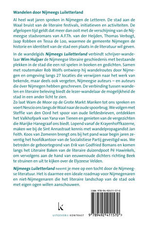 Zo laat Wam de Moor op de Grote Markt Mariken tot ons spreken en voert Nescio ons langs de Waal naar de oude spoorbrug. We volgen met Steffie van den Oord het spoor van oude liefdesbrieven, ontdekken het Valkhofpark van Yana van Tienen en genieten van de vergezichten die Marijke Hanegraaf ons biedt. Lopend vanaf de Krayenhoffkazerne, maken we bij de Sint Annastraat kennis met wandelpropagandist Jan Feith. Koos van Zomeren brengt ons bij het pand waar begin jaren zeventig het hoofdkantoor van de Socialistiese Partij gevestigd was. We betreden de geboortegrond van Erik van Godfried Bomans en komen langs het Literaire Baken van de literaire duizendpoot Pé Hawinkels, om vervolgens aan de hand van eeuwenoude dichters richting Beek te struinen en uit te kijken over de Elyzeese Velden.