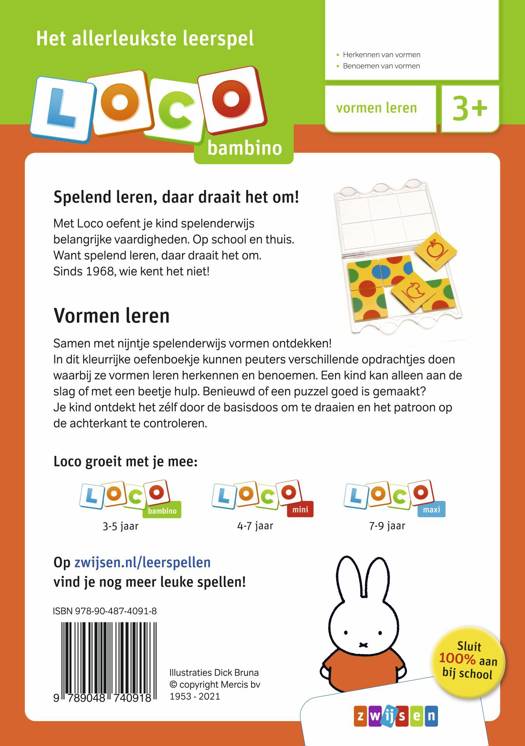 Samen met nijntje spelenderwijs vormen ontdekken! In dit kleurrijke Loco oefenboekje kunnen peuters verschillende opdrachtjes doen waarbij ze vormen leren herkennen en benoemen. Een kind kan alleen aan de slag of met een beetje hulp. Benieuwd of een puzzel goed is gemaakt? Je kind ontdekt het zélf door de basisdoos om te draaien en het patroon op de achterkant te controleren.