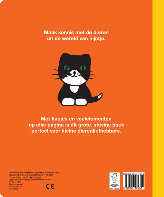 In dit grote dierenboek maak je kennis met een heleboel dieren uit de wereld van nijntje. Een groot stevig boek met veel extra's voor kleine dierenliefhebbers. Voel aan de stofjes en het reliëf in de illustraties, open de flapjes en zie jezelf in het spiegeltje.