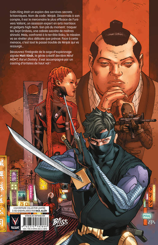 Colin King était un espion des services secrets britanniques. Nom de code : Ninjak. Désormais à son compte, il est le mercenaire le plus efficace de l'univers Valiant, un assassin expert en arts martiaux et gadgets high-tech. Son job du moment : traquer les Sept Ombres, une cabale secrète de maîtres shinobi. Mais, confronté à la terrible Roku, la mission va se révéler plus délicate que prévu. Face à cette menace, c'est tout le passé trouble de Ninjak qui va ressurgir... Découvrez l'intégrale de la saga d'espionnage signée Matt Kindt, le génie créatif derrière Mind MGMT, Rai et Divinity. Il est accompagné par un casting d'artistes de haut vol !