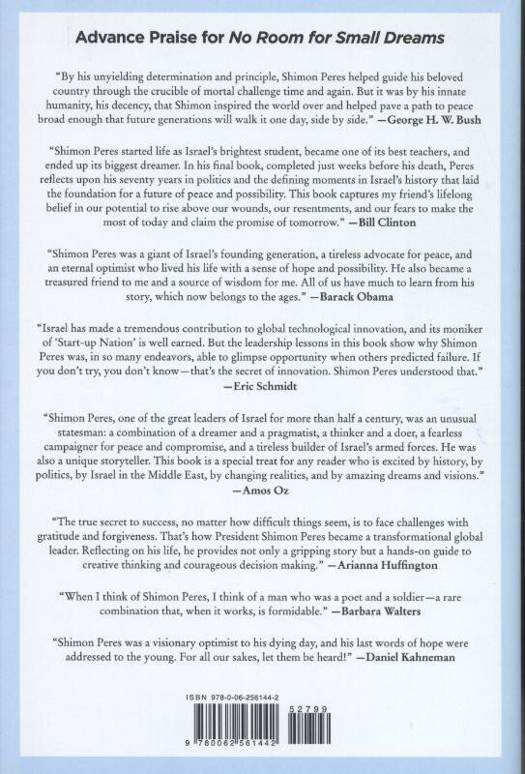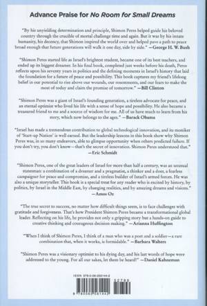 In this, his final work, finished only weeks before his passing, Peres offers a long-awaited examination of the crucial turning points in Israeli history through the prism of having been a decision maker and eyewitness. Told with the frankness of someone aware this would likely be his final statement, No Room for Small Dreams spans decades and events, but as much as it is about what happened, it is about why it happened. Examining pivotal moments in Israel's rise, Peres explores what makes for a great leader, how to make hard choices in a climate of uncertainty and distress, the challenges of balancing principles with policies, and the liberating nature of imagination and unpredicted innovation. In doing so, he not only charts a better path forward for his beloved country but provides deep and universal wisdom for younger generations who seek to lead--be it in politics, business, or the broader service of making our planet a safer, more peaceful, and just place.