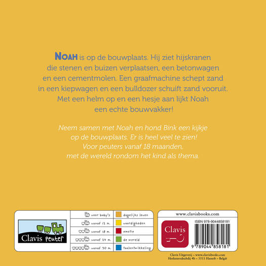 Noah is op de bouwplaats. Hij ziet hijskranen die stenen en buizen verplaatsen, een betonwagen en een cementmolen. Een graafmachine schept zand in een kiepwagen en een bulldozer schuift zand vooruit. Met een helm op en een hesje aan lijkt Noah een echte bouwvakker!