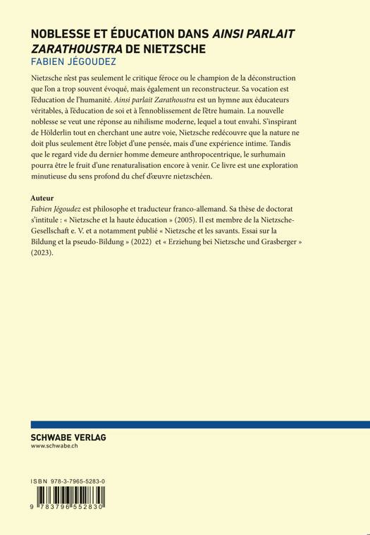 Nietzsche n'est pas seulement le critique feroce ou le champion de la deconstruction que l'on a trop souvent evoque, mais egalement un reconstructeur. Sa vocation est l'education de l'humanite. Ainsi parlait Zarathoustra est un hymne aux educateurs veritables, a l'education de soi et a l'ennoblissement de l'etre humain. La nouvelle noblesse se veut une reponse au nihilisme moderne, lequel a tout envahi. S'inspirant de Holderlin tout en cherchant une autre voie, Nietzsche redecouvre que la nature ne doit plus seulement etre l'objet d'une pensee, mais d'une experience intime. Tandis que le regard vide du dernier homme demeure anthropocentrique, le surhumain pourra etre le fruit d'une renaturalisation encore a venir. Ce livre est une exploration minutieuse du sens profond du chef d'oeuvre nietzscheen.