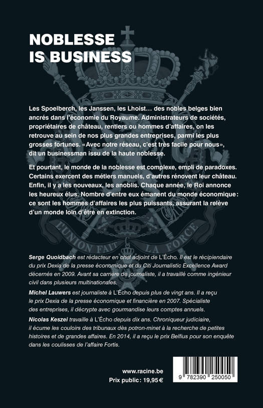 Les Spoelberch, les Janssen, les Lhoist... des nobles belges bien ancrés dans l'économie du Royaume. Administrateurs de sociétés, propriétaires de château, rentiers ou hommes d'affaires, on les retrouve au sein de nos plus grosses entreprises, parmi les plus grosses fortunes. « Avec notre réseau, c'est très facile pour nous », dit un businessman issu de la haute noblesse.Et pourtant, le monde de la noblesse est complexe, empli de paradoxes. Certains exercent des métiers manuels, d'autres rénovent leur château.Enfin, il y a les nouveaux, les anoblis. Chaque année, le Roi annonce les heureux élus. Nombre d'entre eux émanent du monde économique : ce sont les hommes d'affaires les plus puissants, assurant la relève d'un monde loin d'être en extinction.