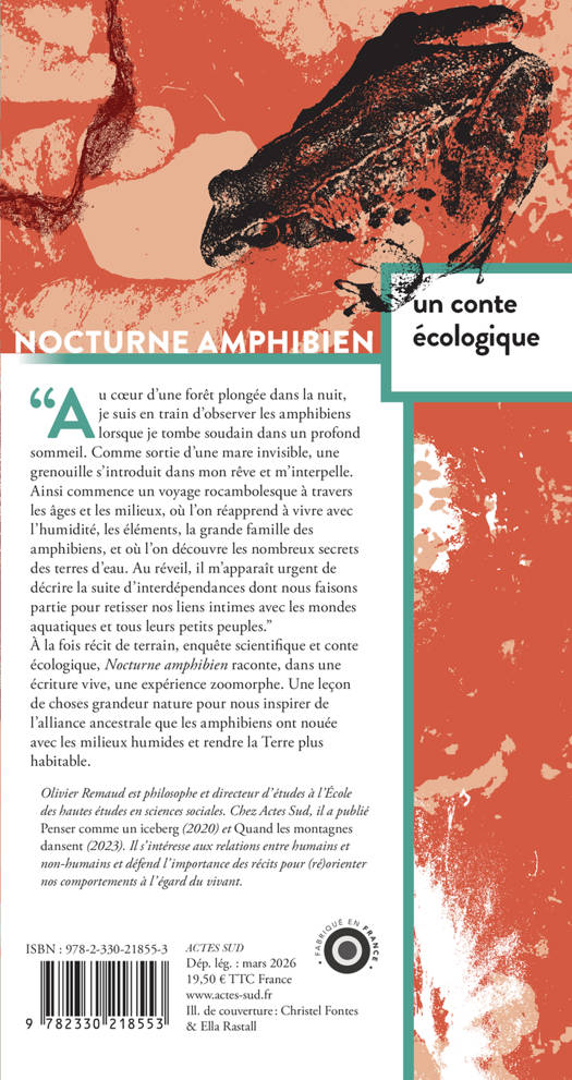 "Au coeur d'une forêt plongée dans la nuit, je suis en train d'observer les amphibiens lorsque je tombe soudain dans un profond sommeil. Comme sortie d'une mare invisible, une grenouille s'introduit dans mon rêve et m'interpelle. Ainsi commence un voyage rocambolesque à travers les âges et les milieux, où l'on réapprend à vivre avec l'humidité, les éléments, la grande famille des amphibiens, et où l'on découvre les nombreux secrets des terres d'eau. Au réveil, il m'apparaît urgent de décrire la suite d'interdépendances dont nous faisons partie pour retisser nos liens intimes avec les mondes aquatiques et tous leurs petits peuples. " À la fois récit de terrain, enquête scientifique et conte écologique, Nocturne amphibien raconte, dans une écriture vive, une expérience zoomorphe. Une leçon de choses grandeur nature pour nous inspirer de l'alliance ancestrale que les amphibiens ont nouée avec les milieux humides et rendre la Terre plus habitable.