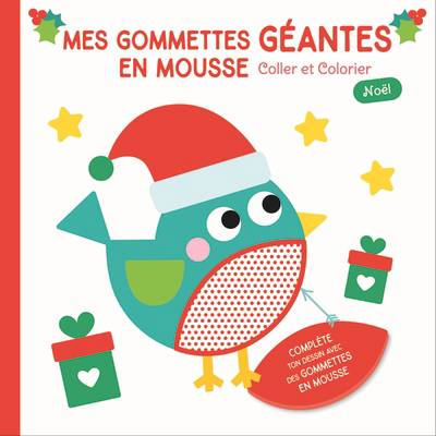 Des illustrations à colorier et à compléter grâce à des gommettes en mousse. Les contours fournissent le code couleur à suivre et des pois indiquent les emplacements où placer les autocollants.