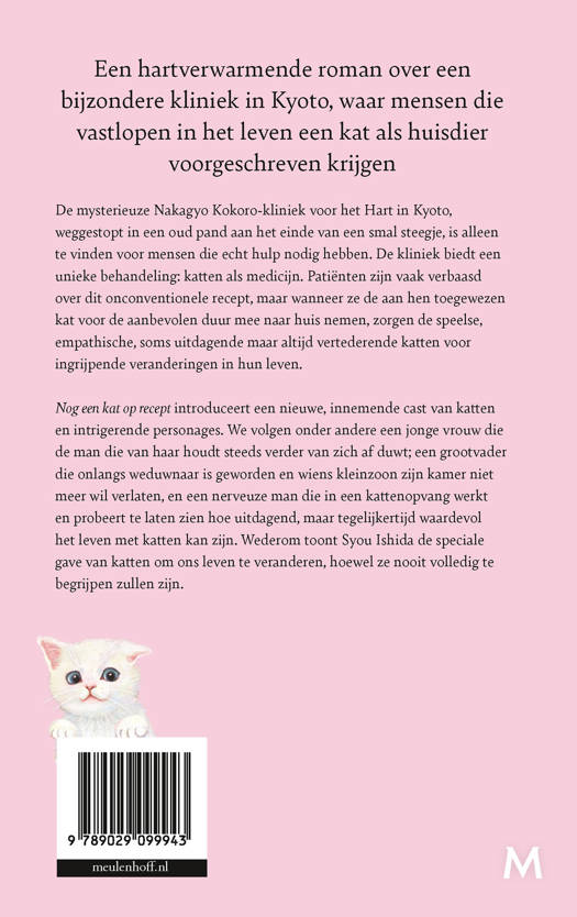 Nog een kat op recept introduceert een nieuwe, innemende cast van katten en intrigerende personages. We volgen onder andere een jonge vrouw die de man die van haar houdt steeds verder van zich af duwt; een grootvader die onlangs weduwnaar is geworden en wiens kleinzoon zijn kamer niet meer wil verlaten, en een nerveuze man die in een kattenopvang werkt en probeert te laten zien hoe uitdagend, maar tegelijkertijd waardevol het leven met katten kan zijn. Wederom toont Syou Ishida de speciale gave van katten om ons leven te veranderen, hoewel ze nooit volledig te begrijpen zullen zijn.