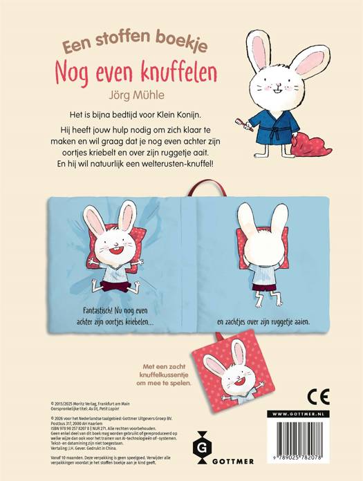 'Nog even knuffelen' is een stoffen boekje met een kussentje om te knuffelen en een lief slaapverhaaltje om voor te lezen. Door de zachte stof en het bijgeleverde minikussentje lijkt het alsof Klein Konijn echt in zijn eigen bedje ligt. Welterusten, Klein Konijn!