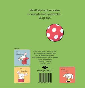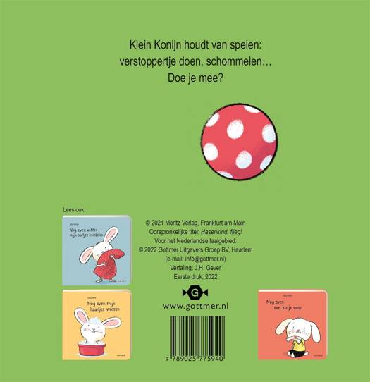In 'Nog even samen spelen', een lief prentenboekje van Jorg Mühle, wordt voorlezen een interactief spel. Peuters laten zelf het konijntje omhoogvliegen op de schommel en spelen verstoppertje met hem.