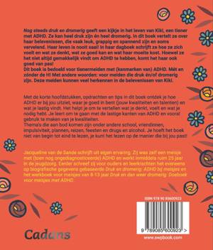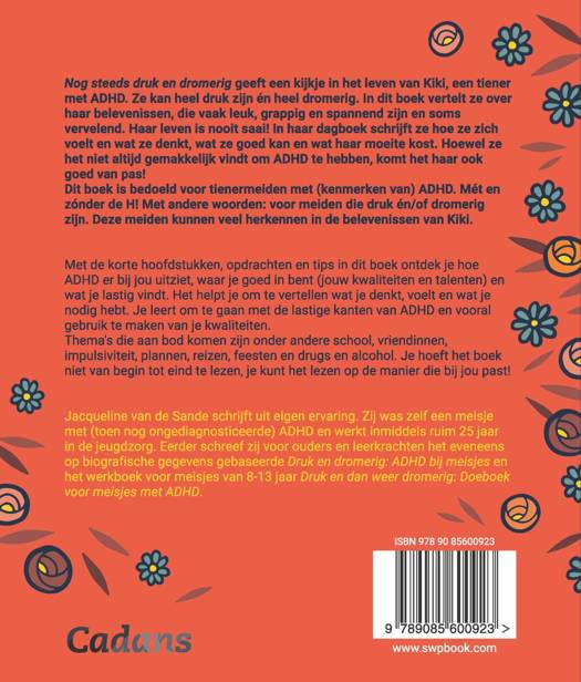 Nog steeds druk en dromerig geeft een kijkje in het leven van Kiki, een tiener met ADHD. Ze kan heel druk zijn én heel dromerig. In dit boek vertelt ze over haar belevenissen, die vaak leuk, grappig en spannend zijn en soms vervelend. Haar leven is nooit saai! In haar dagboek schrijft ze hoe ze zich voelt en wat ze denkt, wat ze goed kan en wat haar moeite kost. Hoewel ze het niet altijd gemakkelijk vindt om ADHD te hebben, komt het haar ook goed van pas! Dit boek is bedoeld voor tienermeiden met (kenmerken van) ADHD. Mét en zónder de H! Met andere woorden: voor meiden die druk én/of dromerig zijn. Deze meiden kunnen veel herkennen in de belevenissen van Kiki.