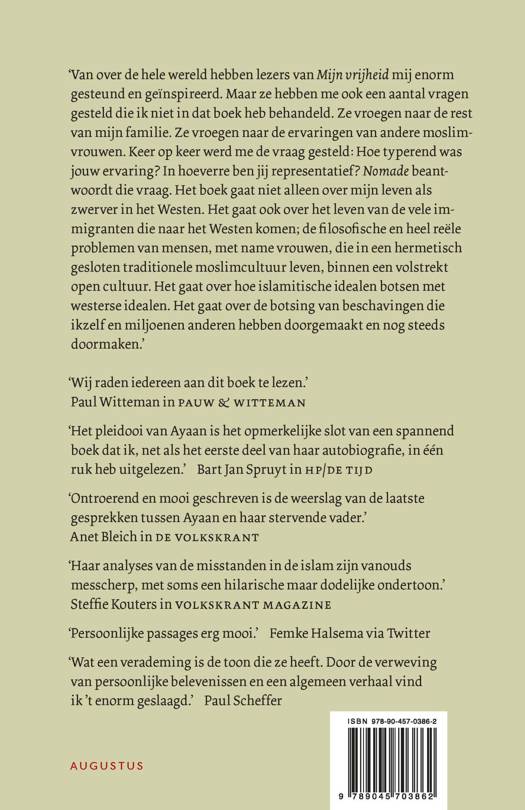 Van over de hele wereld hebben lezers van Mijn vrijheid mij enorm gesteund en geïnspireerd. Maar ze hebben me ook een aantal vragen gesteld die ik niet in dat boek heb behandeld. Ze vroegen naar de rest van mijn familie. Ze vroegen naar de ervaring van andere moslimvrouwen. Keer op keer werd me de vraag gesteld: Hoe typerend was jouw ervaring? In hoeverre ben jij representatief? Nomade beantwoordt die vraag. Het boek gaat niet alleen over mijn leven als zwerver in het Westen. Het gaat ook over het leven van de vele immigranten die naar het Westen komen; de filosofische en heel reële problemen van mensen, met name vrouwen, die in een hermetisch gesloten traditionele moslimcultuur leven, binnen een volstrekt open cultuur. Het gaat over hoe islamitische idealen botsen met Westerse idealen. Het gaat over de botsing van beschavingen die ikzelf en miljoenen anderen hebben doorgemaakt en nog steeds doormaken.''
