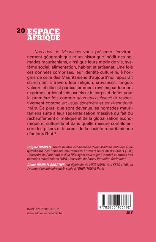 Nomades de Mauritanie vise à comprendre l'identité culturelle des nomades mauritaniens à travers leur environnement géographique, histoire, mode de vie, système social, alimentation, habitat et artisanat et comment elle est révélée par leur art exprimé, sur les objets usuels et le corps et défini pour la première fois comme géometrico-abstrait et respectivement comme art usuel éphémère et art vivant éphémère. De plus, que sont devenus les nomades de Mauritanie et dans quelle mesure sont-ils encore les piliers et le coeur de la société mauritanienne d'aujourd'hui ?