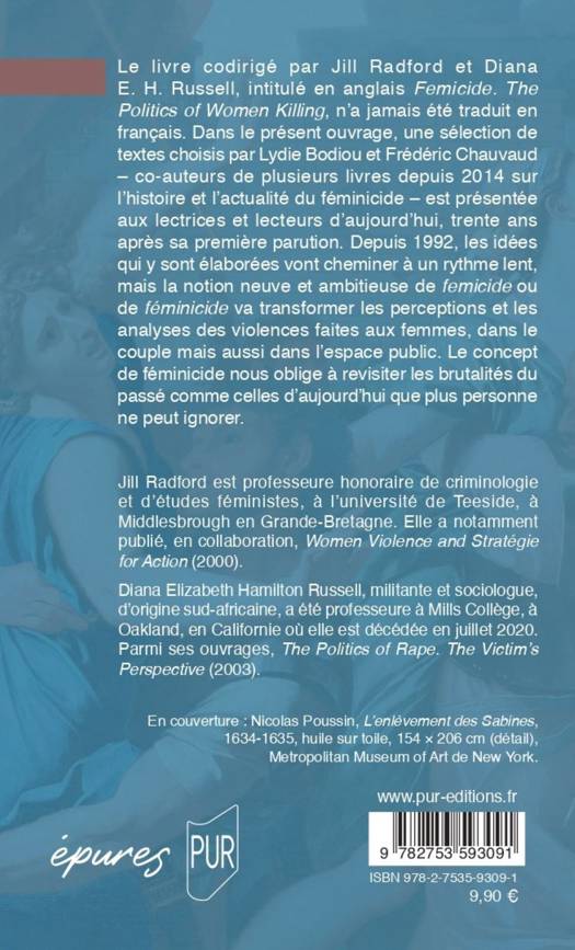 Le livre codirigé par Jill Radford et Diana E. H. Russell, intitulé en anglais Femicide. The Politics of Women Killing, n’a jamais été traduit en français. Dans le présent ouvrage, une sélection de textes choisis par Lydie Bodiou et Frédéric Chauvaud – co-auteurs de plusieurs livres depuis 2014 sur l’histoire et l’actualité du féminicide – est présentée aux lectrices et lecteurs d’aujourd’hui, trente ans après sa première parution. Depuis 1992, les idées qui y sont élaborées vont cheminer à un rythme lent, mais la notion neuve et ambitieuse de femicide ou de féminicide va transformer les perceptions et les analyses des violences faites aux femmes, dans le couple mais aussi dans l’espace public. Le concept de féminicide nous oblige à revisiter les brutalités du passé comme celles d’aujourd’hui que plus personne ne peut ignorer.