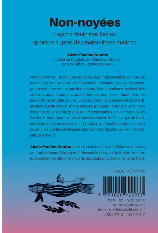 "Non-noyées" est un livre de méditation pour soutenir les mouvements sociaux, un manuel de dé-noyade indispensable, basé sur les ensei- gnements subversifs et transformateurs des mammifères marines. Nos cousines aquatiques sont queers, féroces, complexes, façonnées par les conflits et en lutte pour survivre aux conditions extractivistes et mili- tarisées que le capitalisme a imposé à l'océan. Gumbs utilise un brillant mélange de sensibilité poétique et d'observations scientifiques pour montrer ce qu'elles pourraient nous apprendre, produisant non pas un programme fixe, mais un espace de déploiement pour se questionner. Si nous nous mettons à les écou- ter, les baleines Noires de l'Atlantique du Nord, les dauphins d'eau douce, les phoques à capuchon, pourraient devenir les guides privilégiées des combats décoloniaux et anticapitalistes à mener. C'est une utilisation magistrale de la poésie au service de la justice sociale et des solidarités inter-espèces.