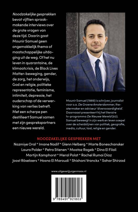 'Mounir Samuel blijft nieuwsgierig tot op het bot en toont zijn liefde voor mensen. Het is tijd voor Noodzakelijke gesprekken. Lees dit boek.’ ADELHEID ROOSEN